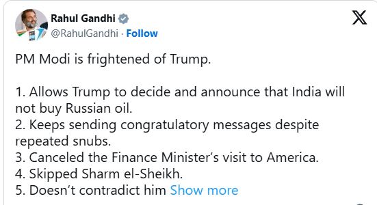 ट्रंप के बयान के बाद राहुल गांधी ने सोशल मीडिया प्लेटफॉर्म एक्स पर एक पोस्ट किया। पोस्ट में राहुल गांधी ने 5 कारण गिनाए। राहुल गांधी ने लिखा कि पहले कारण में लिखा कि ट्रंप को यह निर्णय लेने और घोषणा करने की अनुमति देते हैं कि भारत रूसी तेल नहीं खरीदेगा।