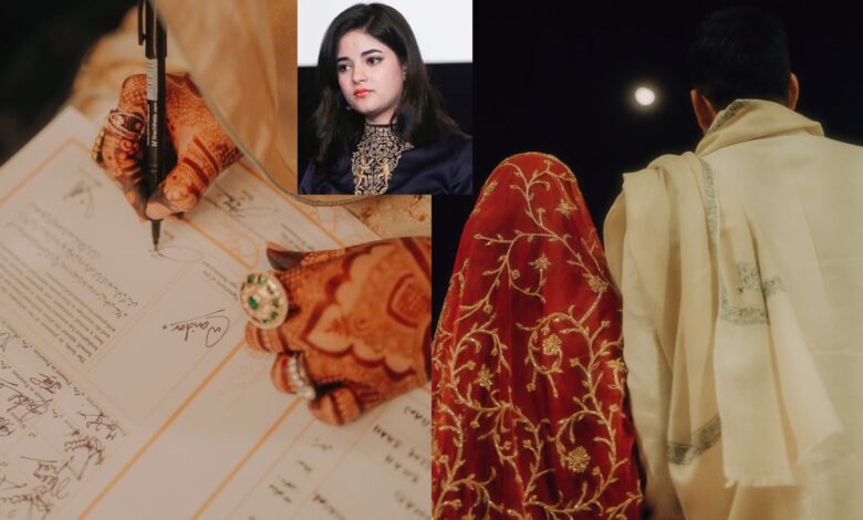 जायरा वसीम ने अपने आधिकारिक इंस्टाग्राम पर अपने निकाह की तस्वीरें शेयर की हैं। पहली फोटो में पूर्व एक्ट्रेस निकाहनामा साइन कर रही हैं और उनके हाथों में शौहर के नाम की मेहंदी रची हुई है।