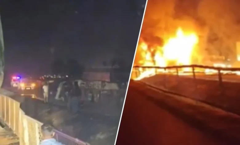 बताया जा रहा है कि दूसरी तरफ से आ रहे एक ट्रक ने डिवाइडर पार किया और बस से टकरा गया, जिससे बस में आग लग गई।